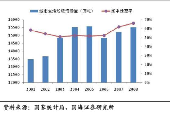 固體廢物可以分為工業(yè)固廢、生活垃圾及危險(xiǎn)廢物,而后者的數(shù)量比重很小。2001年至2009年間,工業(yè)固廢的產(chǎn)生量從約9億噸激增到約21億噸,年均復(fù)合增長(zhǎng)率達(dá)到12%。由于生活垃圾的產(chǎn)生量比較難統(tǒng)計(jì),在統(tǒng)計(jì)局給出的數(shù)據(jù)中一般用垃圾清運(yùn)量指標(biāo)來(lái)代替。生活垃圾的實(shí)際產(chǎn)生量約為清運(yùn)量的兩倍,且清運(yùn)比逐年上升趨勢(shì)。2001-2008年,城市垃圾產(chǎn)量復(fù)合增長(zhǎng)率為5%,而垃圾清運(yùn)量的增速僅為2.03%,整體來(lái)看,垃圾清運(yùn)的速度不及垃圾產(chǎn)生的速度,垃圾圍城現(xiàn)象出現(xiàn),垃圾處理問(wèn)題開(kāi)始引起民眾和政府的高度重視。截止2007年,我國(guó)未經(jīng)處理的城市生活垃圾累計(jì)堆存量已達(dá)70多億噸,侵占土地面積超過(guò)5億多平方米,全國(guó)660個(gè)城市中有約200個(gè)城市陷入垃圾包圍之中。深圳市創(chuàng)新投資集團(tuán)有限公司發(fā)展