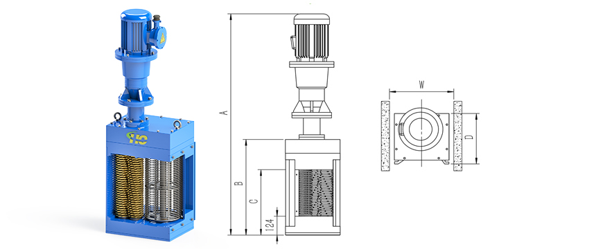 1.固體顆粒隨著污水進入轉鼓渠道式粉碎型格柵機;